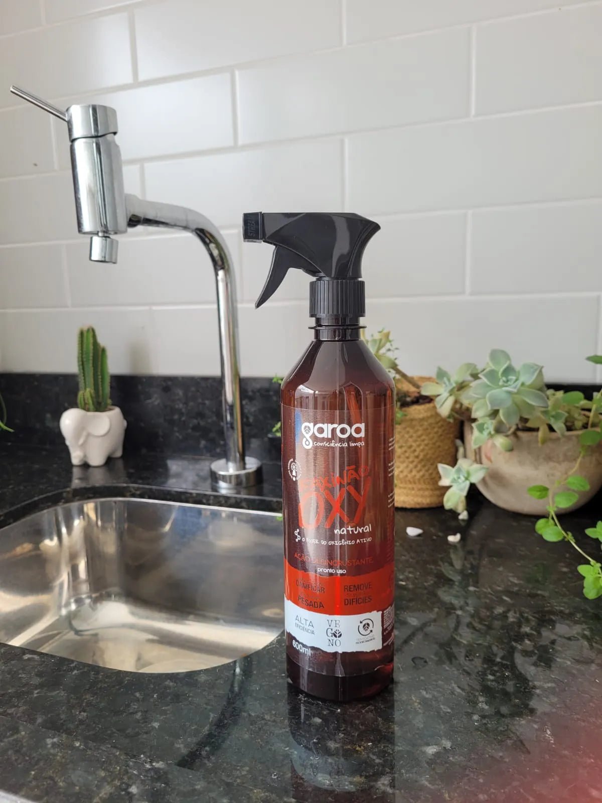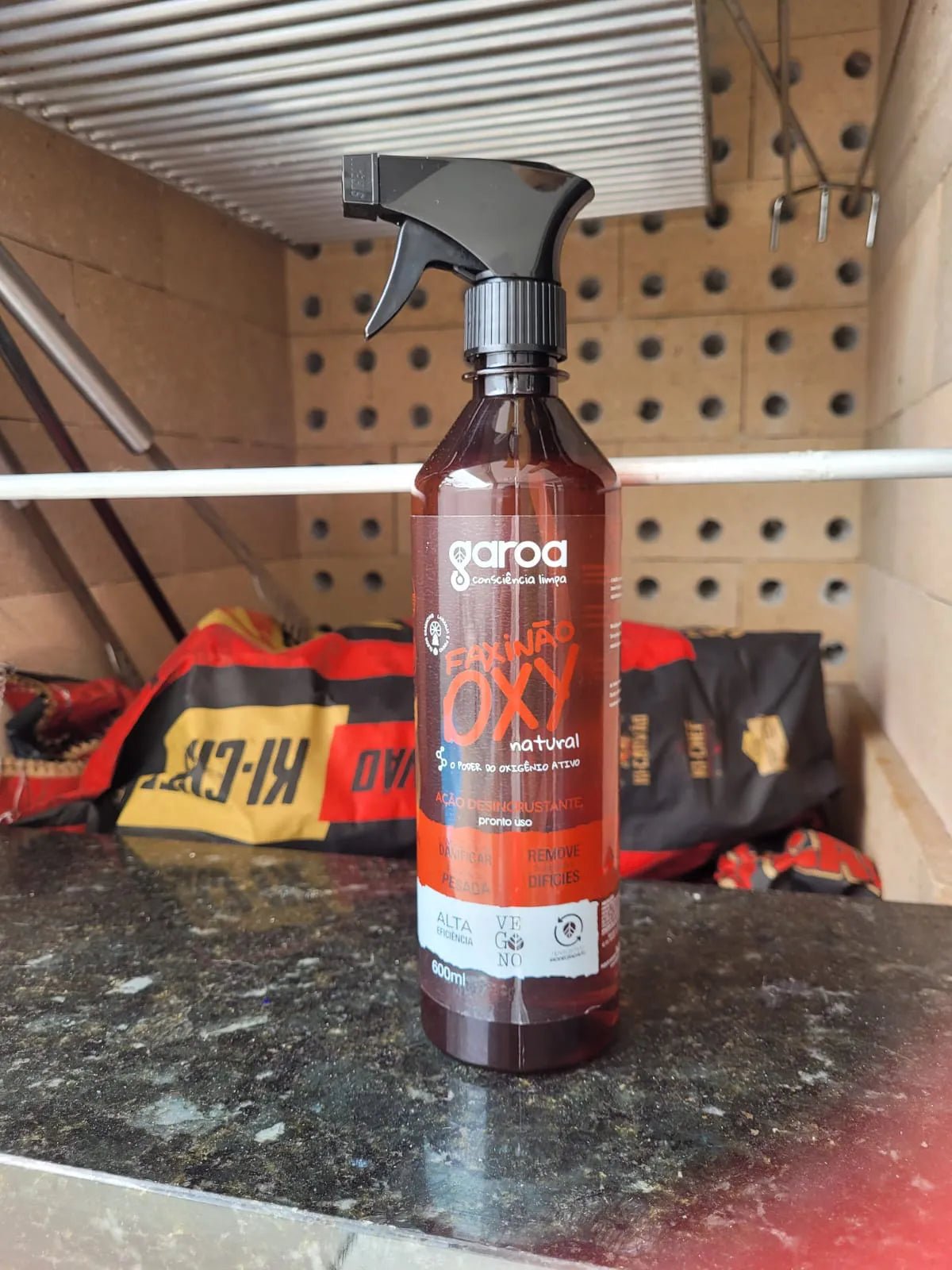 Faxinão Oxy (600ml): Ideal para remoção de sujeira em áreas desafiadoras como churrasqueiras, cozinhas, boxes de banheiro e outros locais que demandam atenção especial na casa, desde que as superfícies possam ser lavadas.